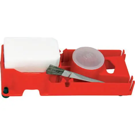En effet cette platine combine à la fois la présence d’une pierre ammoniacale pour décaper les pannes de fers de couvreurs en cuivre, un emplacement pour une pierre ammoniacale de remplacement au dos, un récipient recevant le flux choisi et un emplacement dédié pour caler le bouchon du pot de flux et également un pinceau permettant à l’opérateur de disposer son flux sur les pièces de métal à assembler.